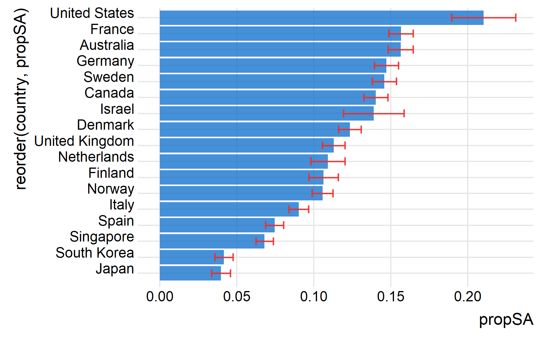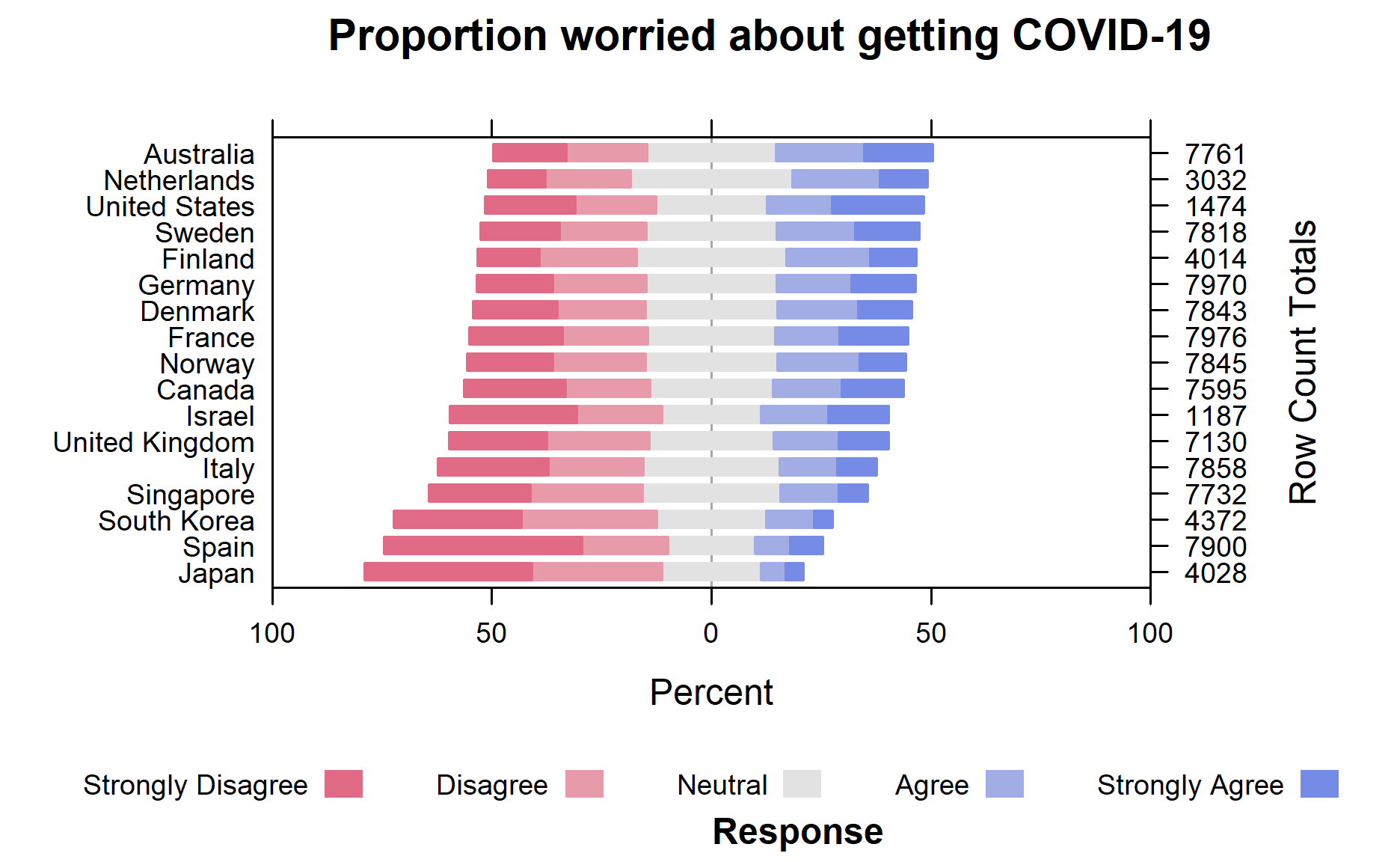 For Singapore, we can see that it has a lower proportion of people who Strongly Agree to vac2_1 (“worried about COVID19”) than Spain. However as their confidence intervals overlap, this difference may not be statistically significant. However when Singapore is compared to Italy, we are 95% confident that Singapore’s proportion is lower than Italy’s since the confidence intervals do not overlap.