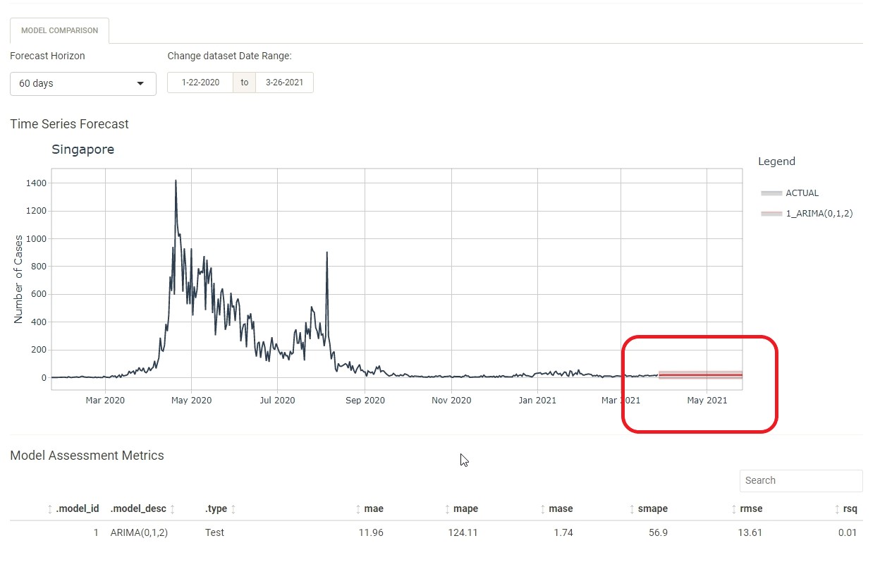 A time series plot with the forecast result would be shown. A table on the outcome whould be shown as well.