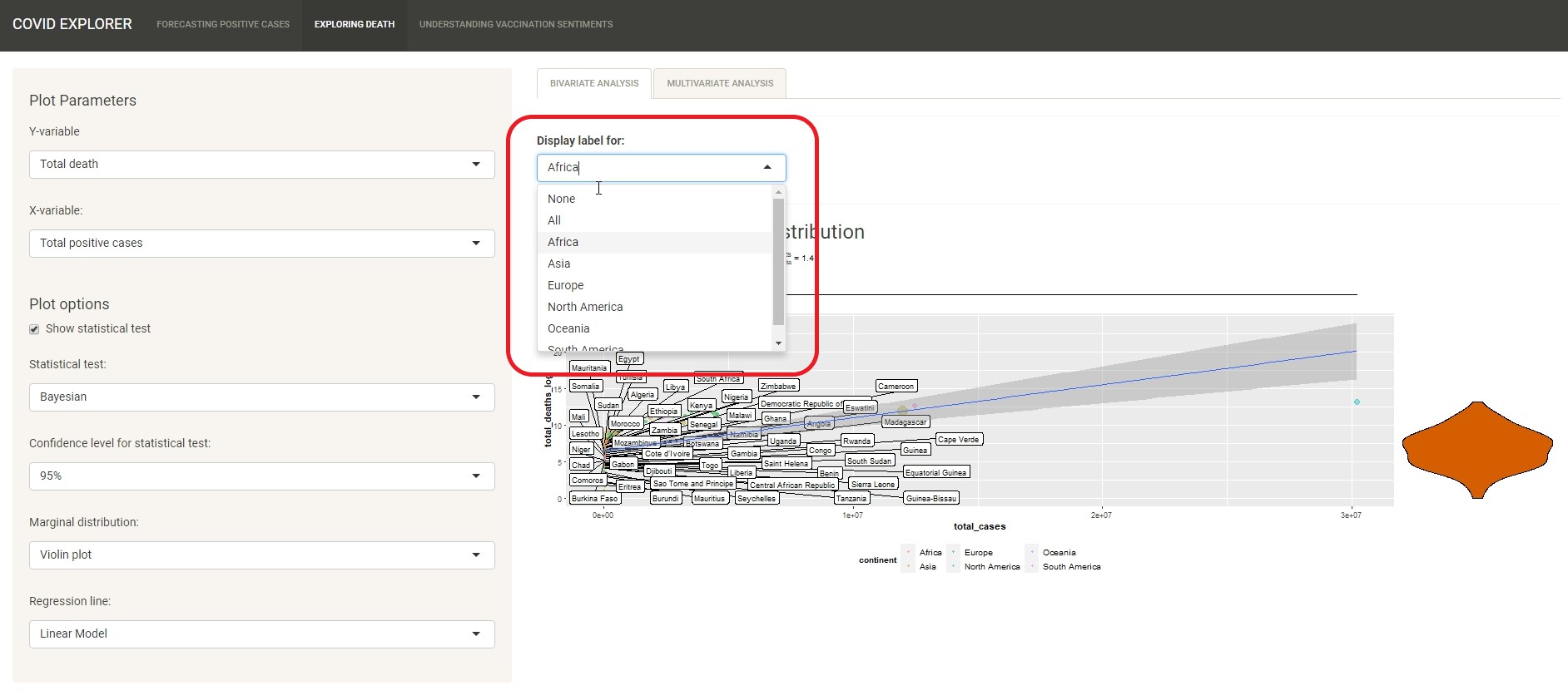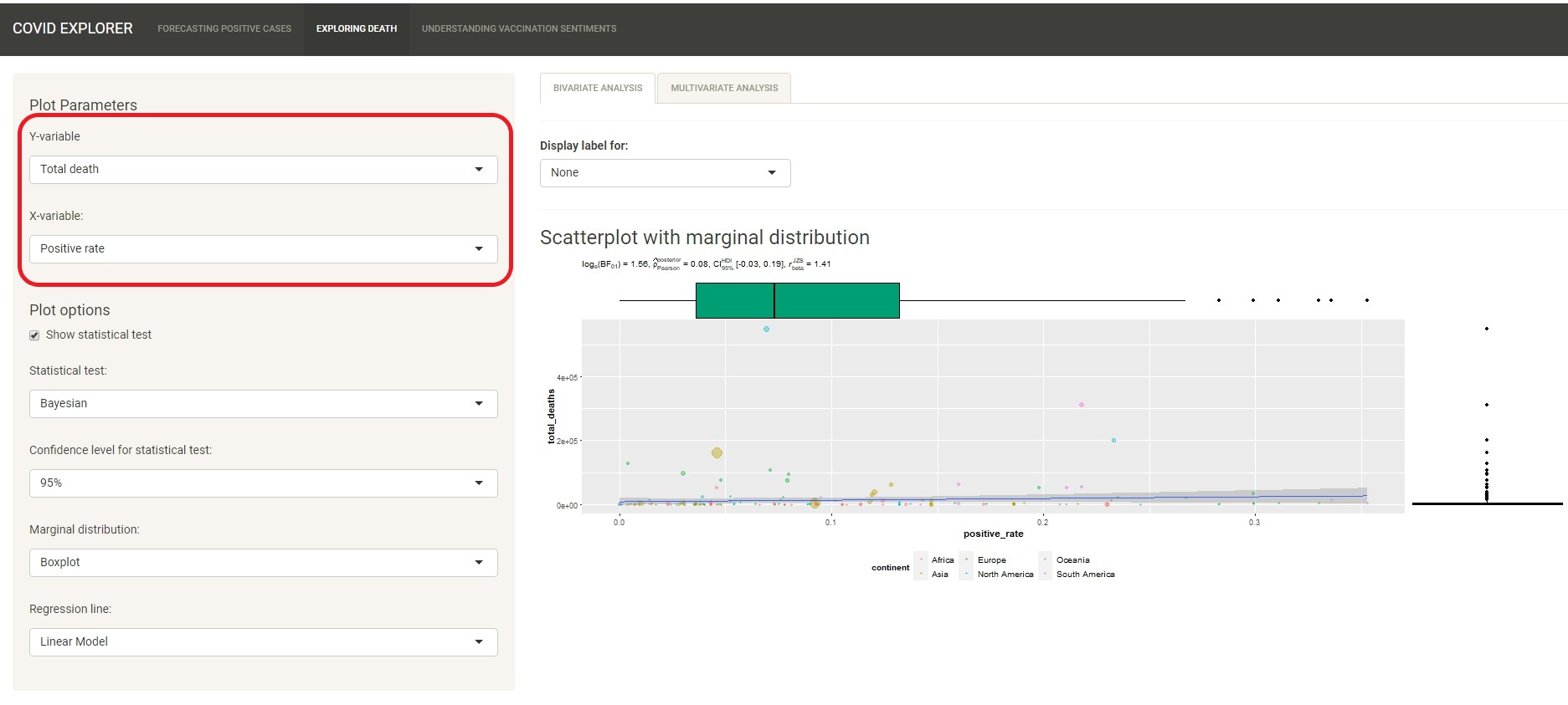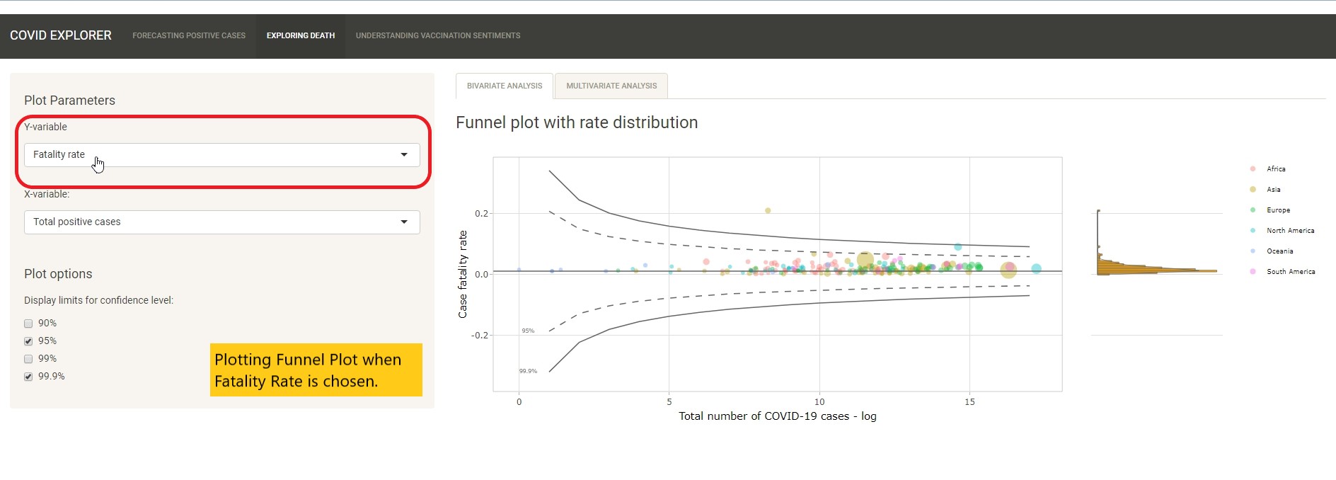 Users are able to select the parameters to be plotted (x and y variables). If the selection is “Total Death” or “Log(Total Death)” for the Y-Axis, Scatterplot would be plotted. If “Fatality Rate” is chosen, Funnelplot would be plotted.