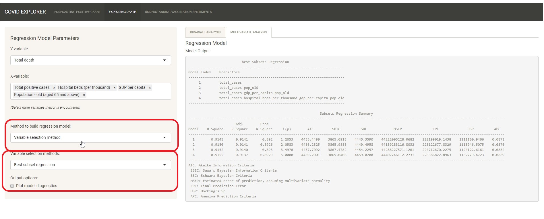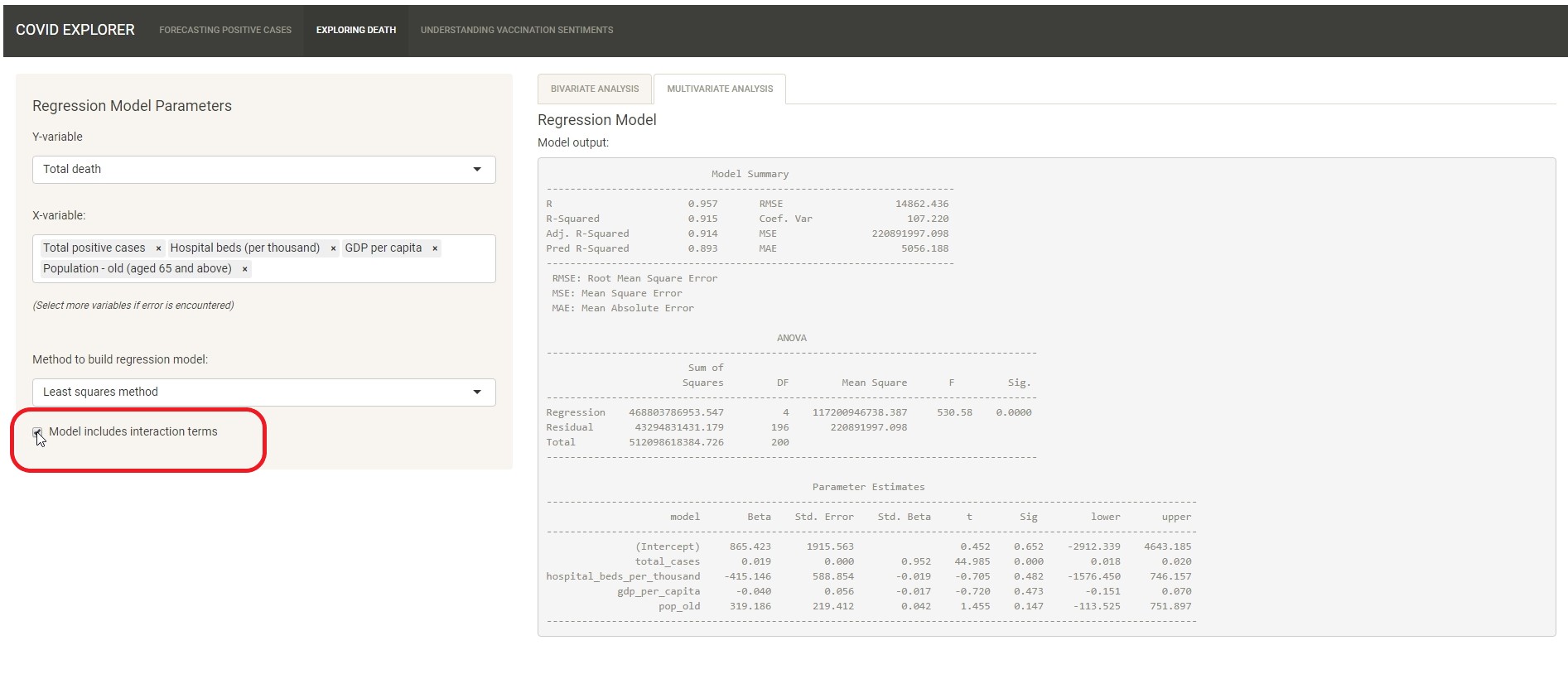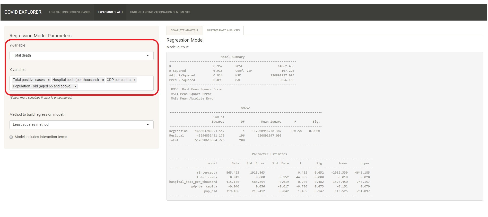 Similar to bivariate, users will need to select the y and x variables for the multivariate analysis. Model summary result would be shown.