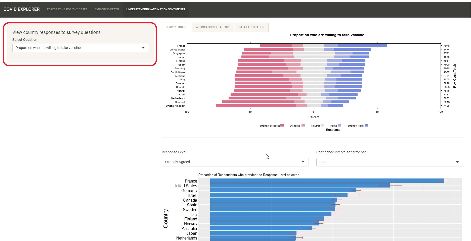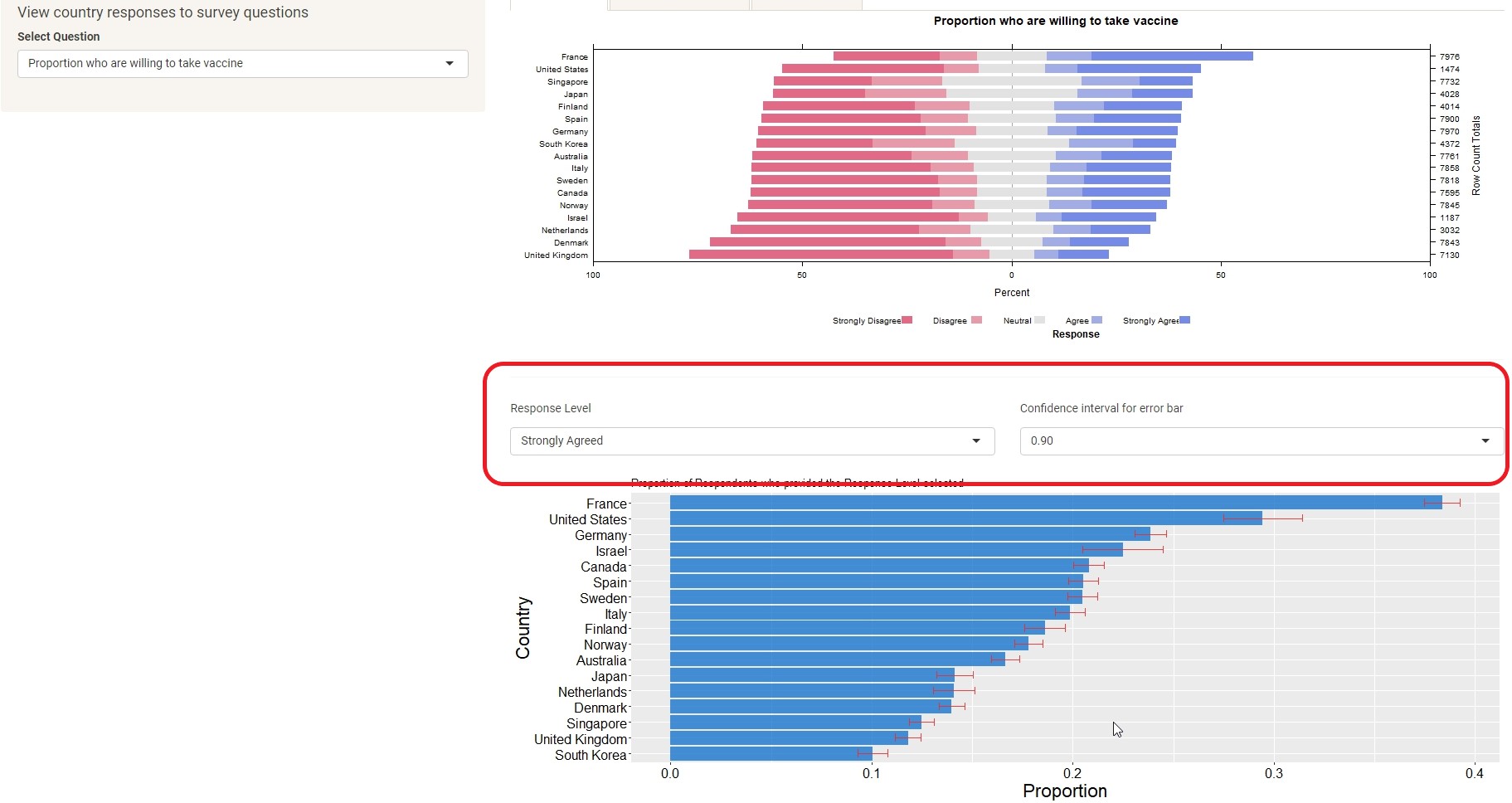 Use this tab to compare proportion of responses across countries for a particular survey question.